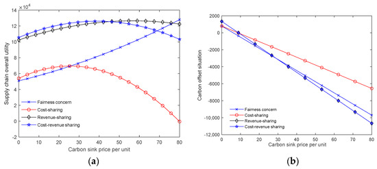 As can be seen in Figure 5a, the cost–revenue-sharing contract shows the best performance in coordinating utility in the supply chain when the unit carbon sink price is cheap, and the revenue-sharing contract becomes the best choice when the carbon sink price is too expensive. This is because the enthusiasm of the enterprise to participate in carbon-neutral declines when the price of carbon sinks increases. As is shown in Figure 5b, extremely expensive carbon sink prices are not conducive to the achievement of carbon neutrality. At this time, sharing the cost of carbon neutrality efforts can better balance the revenue gap between the two sides, so as to improve the overall utility of the supply chain. Therefore, when facing price fluctuations, enterprises should both make contracts and negotiate prices with carbon sink suppliers to ensure the healthy growth of the overall utility of the supply chain and the effective realization of the carbon neutrality process.