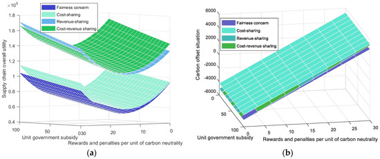 Supply chain utility and carbon emission differences under different government subsidies and carbon neutral rewards and punishments. (a) Utility of supply chain. (b) Carbon neutrality of the supply chain.