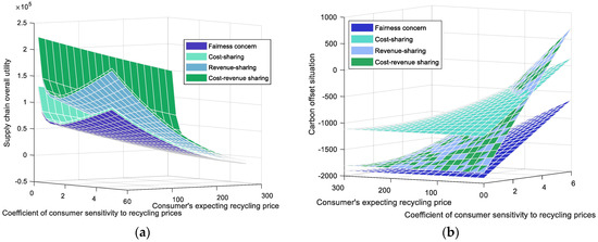 As can be seen in Figure 7b, when the sensitivity coefficient of consumers to the recovering price increases, the carbon offsetting situation in the supply chain shows a completely opposite trend when consumers expect the recovery price to be too high or too low. Specifically, under the same recycling price, when the consumers are not sensitive enough, the amount between carbon emissions and the carbon sink reverse is shown to monotonically decrease with the increase in the recycling price, but shows the opposite trend when the consumers’ sensitivity coefficient is high. On the one hand, when consumers have low expectations of the recycling price provided by the retailer, the increased sensitivity of consumers to the recycling price of the product will lead to an increase in the recycling quantity of the product. At this time, the product sales will remain unchanged, so the quantity of remanufactured products in the supply chain will increase, resulting in the reduction of carbon emissions. In this case, the revenue-sharing contract and cost–revenue-sharing contract are more conducive to promoting the carbon neutrality of the supply chain. On the other hand, when consumers expect a high recycling price, their sensitivity to the recycling price will lead to a decrease in the recycling amount, the gap between carbon emissions and the carbon sink reverse in the supply chain will increase, which is not conducive to the achievement of carbon neutrality. In this case, the cost-sharing contract becomes the optimal choice to pursue carbon offsetting.
