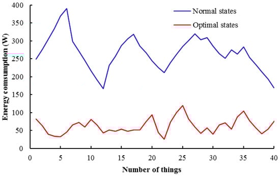 Figure 2 depicts the energy consumption in two normal states and the optimal state chosen by the FCPSO algorithm for information transmission. As shown in Figure 2, when the FCPSO is used to transfer information between the objects and to the center, the energy of the objects is drastically reduced.