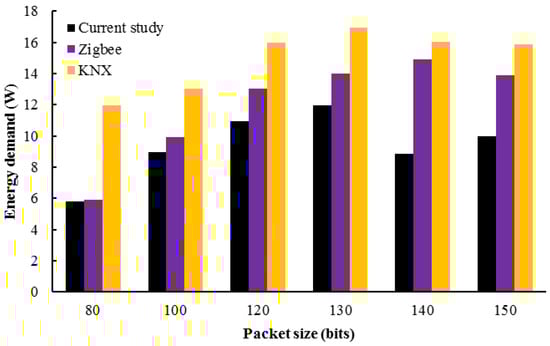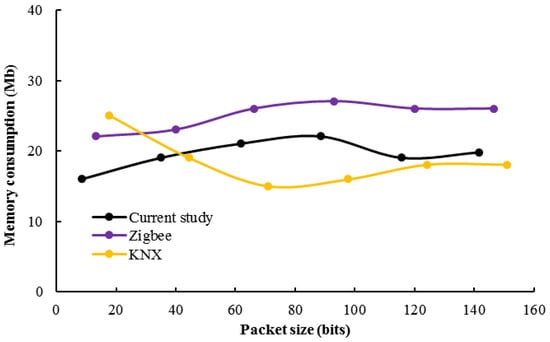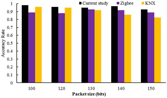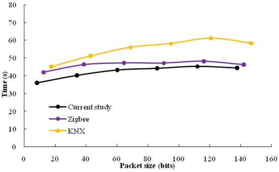 The execution time criterion is subjected to further testing as well. When compared to the amount of time needed to complete authentication requests in IoT-based smart buildings, this metric appears to be significantly faster. A comparison has been made between three methods. The first option is to use the FCPSO algorithm to optimize the method. The second approach involves performing an analysis of ZigBee. ZigBee is a type of wireless network that accomplishes its tasks through the transmission of a signal from one piece of hardware to another. This contributes to the network becoming more robust and extensive. ZigBee can be utilized in a wide variety of applications, including door locks, thermostats, dimmer switches, and many others []. KNX is the third approach, and is an open-source protocol that is typically utilized for automation. Because each KNX system is intelligent and operates on more than one physical layer, the functionality of other devices connected to the network is unaffected if one of the systems fails. KNX is a building control system []. As can be seen in Figure 5, the packet sizes have become significantly bigger across the board.