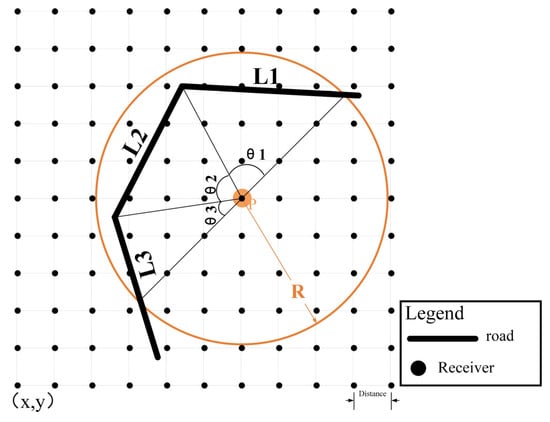 For any receiving point P in the network, its noise will be affected by the line sources of multiple roads within the receiving radius R, as shown in Figure 2. According to the principle of energy superposition, the equivalent sound level of the receiving point is equal to the sum of the noise contribution of all road segments, shown in Equation (6).