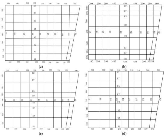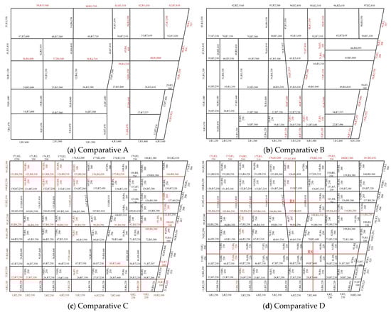 In this paper, the width of the single lane is taken to be 3.5 m. The network density (ND) and Lane Area Ratio (LAR) are 6.5 km/km2 and 8.4%, respectively, in the case network. With the same LAR, the total traffic capacity of different networks remains approximately stable to meet normal traffic demands. In addition, the road distance for different network densities is determined based on the Standard for Urban Residential Area Planning and Design GB50180-2018. To keep the LAR constant, four groups of comparative networks are set by adding or removing roads in the network, and the densities of the four networks are 4.5 km/km2, 5.5 km/km2, 7.5 km/km2, and 8.5 km/km2, respectively. The network structures are shown in Figure 5.