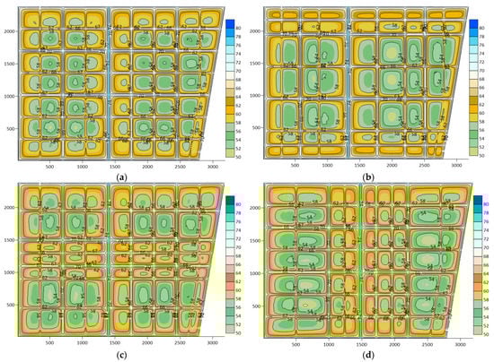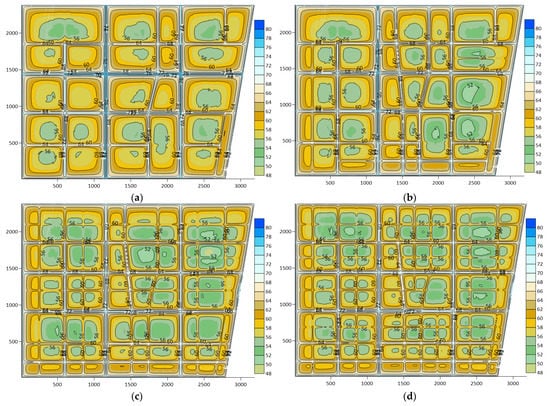After adjusting the network structure, the improved SUE model is used to rearrange the traffic flow of the network, while controlling the total traffic volume of the network remains constant. The traffic flow of each road under different networks is obtained. Based on the road traffic flow and Equation (7), different network noise data are simulated. The traffic noise distributions of different networks are shown in Figure 6. It can be clearly shown that as the network density increases, the light green area in the noise spatial distribution map gradually increases, which means that the network noise spatial distribution is a decreasing trend. The closer to the road, the greater the noise value, especially on the arterial roads, which matches the law of the spatial distribution of noise.