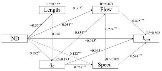 The influence of network characteristics on traffic noise is well recognized and regression models are commonly used to investigate the relationship between network characteristics and traffic noise. However, a simple regression model can only consider the direct impacts of network characteristics on traffic noise, while a structural equation model can be expressed as a path model, allowing the estimation of direct and indirect impacts of network characteristics on traffic noise through various mediating variables [47,48]. Therefore, SEM is a more powerful alternative to multiple regression analysis. In this way, it explores the influence mechanisms of network characteristics on traffic noise.