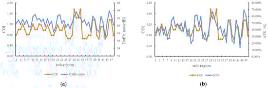 Figure 12. COI in relation to traffic noise and NER. (a) traffic noise. (b) NER.