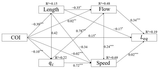 The structural equation model is established with COI as the independent variable, traffic noise data as the dependent variable, and road characteristics and traffic flow parameters as the intermediate variables, as shown in Figure 13.