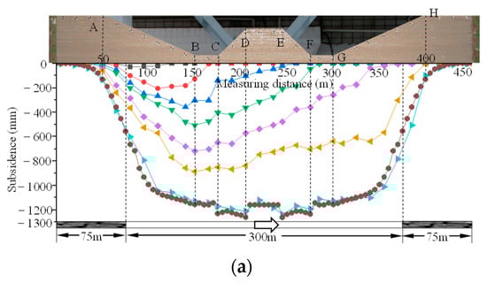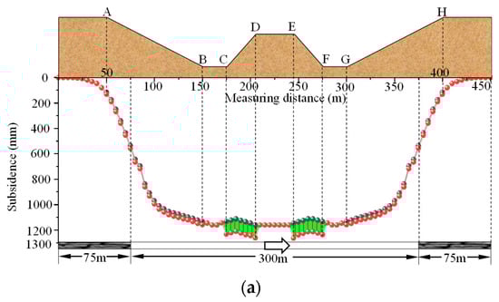 As the coal seam advances from 0 m to 300 m, the height of the caving zone and the height of the fracture zone increase with the increase in advancing distance. Figure 10b shows that full mining is achieved when the coal seam is mined for 300 m. The height of the caving zone and the fracture zone reach the maximum values of 7.5 m and 25.5 m, respectively. At this point, the slope area is in the bending subsidence zone and the deformation is continuous. High-precision total station measurement was used to record the dynamic movement and deformation process of the slope surface during coal seam mining. The movement and deformation curve of surface during the mining process and the theoretical prediction curve in Figure 9 are summarised in Figure 11.