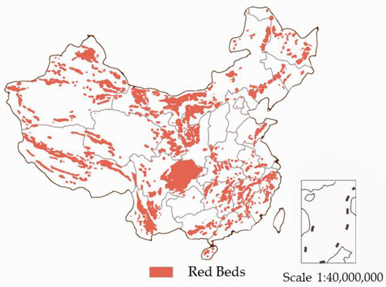 Plastic film and non-woven fabric are commonly used ecological restoration materials in northern and southern China, respectively, playing a role in water and soil conservation. Currently, plastic mulch and non-woven fabrics are mainly made of man-made materials prone to environmental pollution. Due to the inability to take into account the environmental characteristics of ecological restoration in northern and southern China, plastic mulch and non-woven fabrics cannot be widely used nationwide and their suitability for national ecological restoration is not high. Therefore, it is not possible to further form a national universal system, resulting in high-cost engineering restoration. The redbeds are widely distributed in China, covering an area of 1,887,500 km2 [1] (Figure 1), being environmentally friendly and low cost, and are beginning to be applied in the engineering field. Adapting measures to local conditions, using materials from nearby areas, and scientifically carrying out ecological environment restoration are also methods advocated by engineering ecological restoration. Therefore, red weathered soil can be selected locally to produce a mud film to replace polluting mulch and non-woven fabrics. Ecological restoration entails the implementation of measures according to local conditions and the use of local materials; the measures must be carried out in a scientific manner [2]. The mud skin of weathered redbed soil is often used to control soil desertification and repair slope; its integrity is an important indicator to measure the repairing effect of the mud [3]. Integrity includes skid, acid, and alkali resistance and compression resistance [4,5,6,7,8]. Weather conditions in various regions of China are inconsistent, and thus, the requirements for the integrity of weathered natural redbed soil mud in different regions vary [9]. Therefore, it is necessary to formulate zoning and grading standards for the materials used to improve the integrity of the weathered redbed soil surface and determine the driving environmental factors to support optimal ecological restoration [10].