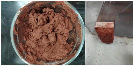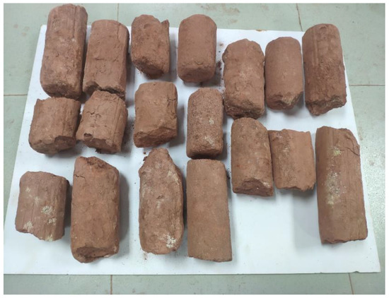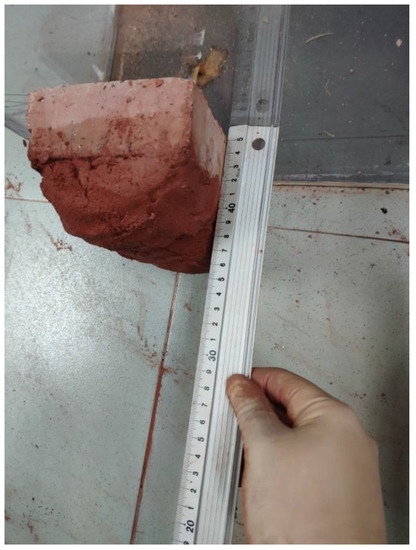 In this study, we selected the weathered redbed soil commonly found in China as the slurry improvement material. The redbeds in China are mainly composed of red continental clastic rocks and their weathered materials deposited in the Mesozoic and Cenozoic eras. The redbeds in this era have the same sedimentary background and therefore have similar properties [33,34]. The test samples were sampled 12 m underground in the Pearl River Delta in South China, which is a typical Mesozoic–Cenozoic redbed with the same properties as the redbeds in other provinces of China. The sample is representative [35]. In general, the redbed samples had interacted with air, water, carbon dioxide, and other substances for a long time, resulting in complex chemical reactions, and were influenced by temperature, water, and biology. Notably, the redbed on the surface or close to the surface disintegrated easily, forming fragments or sand particles of different sizes, referred to as ‘weathered redbed soil’ in this study, as shown in Figure 2.