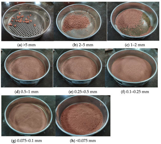 We introduced the dry weathered redbed soil particles into a standard sieve, as shown in Figure 3; the samples were then vibrated mechanically for more than 20 min and we weighed the mass of the soil particles for different particle sizes to obtain the particle gradation of the sample. After screening the soil, we found that the content of the redbed weathered soil sample with a particle size of less than 1 mm is 5–85%. Therefore, with a gradient of 10%, a total of 9 experimental groups were set up, with sample particle sizes smaller than 1 mm and contents of 5%, 15%, 25%, 35%, 45%, 55%, 65%, 75%, 85%. The 9 experimental groups cover the particle grading range of redbed weathered soil samples, which can further obtain the most suitable particle grading for film formation. On the basis of this particle grading, 77 materials were added to conduct a material-based film-formation test [35]. The grading of soil particles was conducted according to the Standard for Geotechnical Test Methods, and the thickness of the mud film was measured with a ruler [36].