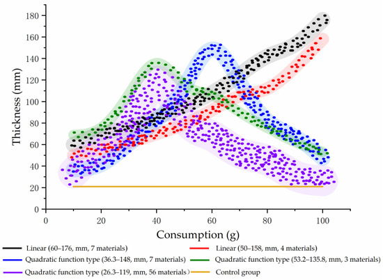 The influence of the improved material on the mud-skin thickness was then summarised into linear and quadratic function types, as shown in Figure 7. The yellow curve represents the control group. When no other improved materials were added, the increase in the use of the soil had no effect on the thickness of the mud crust. Compared with the control group, adhesives, minerals, cellulose, building materials, and plants all improved the thickness of the mud skin.