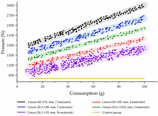 Starting from 100 N for different groups of mud, we increased the pressure, with a gradient of 10 N, until the mud skin tore, and recorded the pressure value to determine the influence of different improved materials on the compression resistance of the mud. The influence of the improved materials on the compression resistance of mud was linear, as shown in Figure 9. The yellow curve was the control group. When no other improved materials were added, the increase in the use of the weathered redbed soil had no effect on the compressive strength of the mud skin. Compared with the control group, in the other groups, adhesives, minerals, cellulose, building improvement materials, and plants improved the compression resistance of the mud skin.
