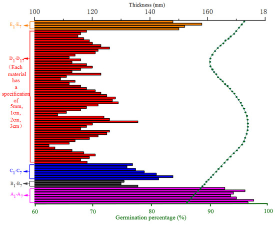 Combined with the influence of improved materials, we also determined those improved materials that had a greater impact on the thickness of the mud skin. The influence of plants and building improvement materials on the skid resistance of the mud skin could be explained as a quadratic function and the peak of the function corresponding to the amounts of the improved materials (40, 50, and 60 g). The influence of binder and cellulose on the skid resistance of the mud skin was linear, and we used 100 g of the improved material as the dosage, as shown in Figure 10. The thickness of the mud skin without modified material was 21 mm and with adhesive was 176 mm, indicating an increase of 738%. The thickness of the mud skin after the addition of cellulose was 158 mm, indicating an increase of 652%. The thickness of the mud crust after the addition of minerals was 135.8 mm, indicating an increase of 547%, and that after the addition of plants was 119 mm, indicating an increase of 467%. Additionally, the mud-skin thickness after the addition of building improvement materials was 148 mm, indicating an increase of 605%. The thicker the mud skin, the stronger the skid resistance; the increase in the skid resistance of the mud skin was significant after the addition of adhesives, cellulose, building improvement materials, minerals, and plants. Among all the improved materials tested, the No. 6 adhesive had the greatest effect on increasing the skid resistance of the mud skin, with the thickness of the mud skin being 176 mm, indicating an increase of 652%. The three-centimetre wormwood straw increased the mud-skin thickness to 26.3 mm, indicating an increase of 24%, and the seed germination rate was 85–95%.