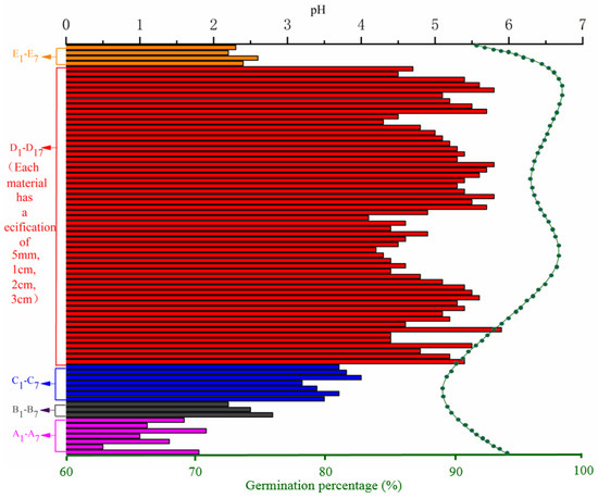 The influence of mineral-modified materials, plants, building improvement materials, adhesives, and cellulose on the acid and alkaline resistance of the mud skin was linear, with the maximum dosage of modified materials being 100 g, as shown in Figure 11. After the addition of hydrochloric acid solution, the pH value of the mud skin without any added improved material was 6. After adding adhesives, the pH of the mud was 0.5. For added cellulose, the pH was 0.8, indicating a decrease of 5.2. The pH value of the mud skin with added minerals was 0.9, indicating a decrease of 5.1. For added plants, the pH was 1.7, indicating a decrease of 4.3. For added building improvement materials, the pH was 1.4, indicating a decrease of 4.6. From strong to weak, the anti-acid enhancement effect of the mud skin was as follows: additions of adhesives, cellulose, minerals, building improvement materials, and plants. Among all the improved materials tested, the No. 6 adhesive had the greatest effect on increasing the acid resistance of the mud skin; the pH of the mud skin was 0.5, indicating a decrease of 5.5. The least significant effect was that of starch, with the pH of the mud skin being 5.8 and the seed germination rate being 90–95%.