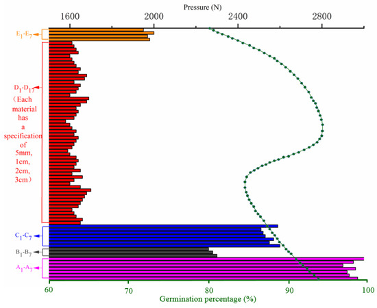 After pressure was applied, the mud skin developed without the addition of any modified material tore at 800 N. For the group with added adhesives, the pressure at which the mud skin tore was 3000 N (an increase of 275% in the pressure). For the group with added cellulose, the pressure at which the mud skin tore was 2000 N (an increase of ~150%). For the group with added minerals, the pressure at which the mud crust tore was 2300 N (an increase of 186%). For added plants, the pressure at which the mud skin tore was 1700 N (an increase of 113%). For added building improvement materials, the pressure at which the mud skin tore was 2600 N, (an increase of 113%). The strengthening effect of the materials on the compression resistance of the mud skin from strong to weak was in the following order: adhesives, building improvement materials, minerals, cellulose, and plants. Among all the improved materials tested, the No. 6 adhesive had the greatest effect on increasing the compressive strength of the mud skin, with the pressure of the mud skin being 3000 N, indicating an increase of 275%. Larch tannin extract had the least impact on the compressive strength of the mud skin, with the pressure being 1000 N and the seed germination rate being 80–93%.