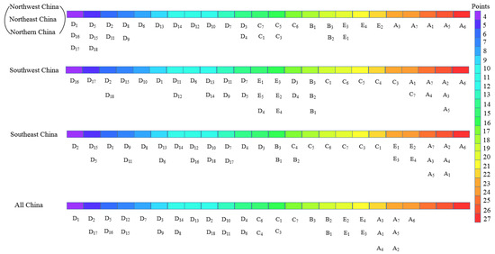 Based on the characteristics of the zoning requirements for the properties of natural redbed weathered soil and mud film, a weight of 1.5 times the score is given for the integrity and skid resistance required by the zoning, and a weight of 1.25 times the score is given for acid and alkali resistance [38], the evaluation scores of the north-western, northern, and north-eastern zoning are explained below: