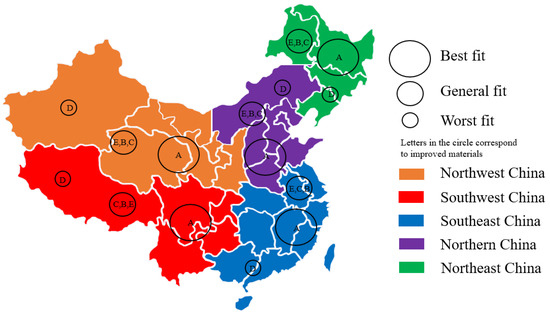 The climatic characteristics of dry and wet cycles in each division of China are inconsistent, and the requirements for the integrity of the mud skin of naturally weathered redbed soil are also different. The properties of the natural redbed soil in each region of China are similar (Cheng, 2004); therefore, it is necessary to formulate zoning and classification standards for improved materials, while determining the driving environmental factors. The north-west, north-east, and northern regions of China experience drought frequently, and the land is undergoing desertification; therefore, there is a great demand to improve the acid and alkali resistance of the mud skin in these regions. The construction and development efforts of South-West China are large; there are many engineering projects, and there is a great demand for the improvement of the compression resistance of mud skin in the region. Additionally, there are many slopes in South-East China, posing serious landslide risks; therefore, improving the skid resistance of the mud skin in this region can help reduce the risks to life and property [37]. Combined with the experimental study of the upper and lower limits of the nature of mud skin, we have suggested the restoration of the ecological environment in China based on the weathered redbed soil commonly found in the country; the classification of the properties of improved materials is shown in Figure 13.