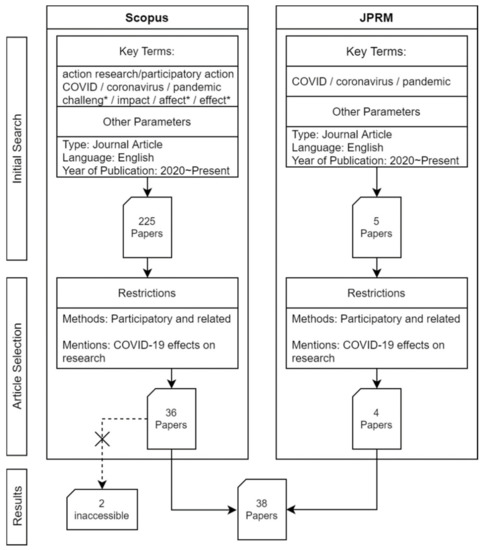 In order to better understand the extent of the impacts of the COVID-19 pandemic on participatory action research (PAR) and related approaches, and as a way of comparing perceptions from our project with those of other academics, a rapid literature review was conducted in a systemic manner. Rapid reviews can be carried out in a shorter time than traditional reviews without significantly impacting the conclusions drawn, with the one limitation being the reduced scope of the search [20]. The limitations imposed on this literature search, as a result of the project’s limited timeframe, consist of the requirement for peer-reviewed journal articles, as well as the use of only two scholarly databases: Scopus and the Journal of Participatory Research Methods (JPRM). Figure 1 provides a detailed representation of the review process.