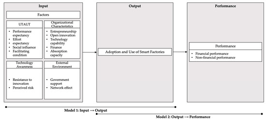 As a result of extracting the factors of adoption and continuous use of smart factories by synthesizing individual empirical analysis studies, it was determined that internal and external factors affect the adoption of smart factories. Specifically, organizational characteristics, technology recognition, and external environment can be classified as higher-level factors and sub-factors can be extracted from these higher-level factors. However, since many studies have adopted the theoretically established UTAUT model, UTAUT factors were classified into independent higher-level factors for empirical investigation of this model. Accordingly, 13 sub-factors from the four higher-level factors were defined as factors for smart factory adoption and continuous use. In addition, significant achievements were made following the adoption of smart factories and empirical analysis studies were synthesized, and these achievements were classified into financial and nonfinancial achievements. Therefore, the overall framework of this research model includes variables of input, output, and performance. Input includes factors that affect the adoption of smart factories, output is the adoption and use of smart factories, and performance refers to business performance resulting from the adoption and use of smart factories. A schematic expression of this model is shown in Figure 1.