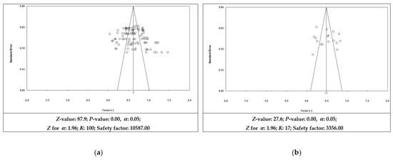 Publication bias was analyzed in Figure 2 to verify that empirical analysis studies subject to meta-analysis were collected without bias to specific trends. First, a funnel plot was plotted to visually verify the convenience of publication, and it was judged that the bias was low because the effect size was generally distributed in a symmetrical form. By calculating the safety coefficient to numerically verify the convenience of publication, 10,587 were identified in Model 1 and 3356 in Model 2. This figure is sufficiently larger than the 5K + 10 in each model, so it can be evaluated that the concerns of publication convenience are generally low [65].