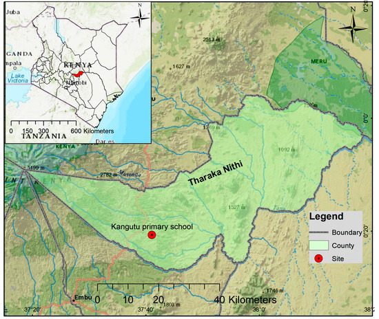 We carried out the study in Meru south sub-County, Tharaka Nithi County. The experimental site was at Kangutu Primary School (00°98′ S, 37°08′ E) farm (Figure 1). The sub-County lies 1468 m above sea level (a.s.l) and is located on the Upper Midland 2 (UM2) agroecological zone (AEZ) [28].