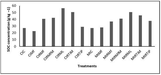 Soil organic carbon (SOC) was significantly (p < 0.0001) higher under CtRML, CtRTiM, MtRML, MtRTiM, CtRMfM, MtRMfM, CtRMf, MtRTiP, MtRMf, CtRTiP, and MtMf by 108, 87, 87, 69, 56, 51, 50, 39, 36, 7, and 3% compared with the control (CtC) (Figure 2). In contrast, CtMf (22.65 g kg−1C) treatment decreased SOC content by 16% compared with CtC (27.11 g kg−1C).