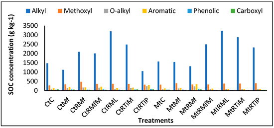 The results of CPMAS NMR are shown in Figure 3. Briefly, alkyl C was significantly (p < 0.0001) higher under MtRML, CtRML, MtRTiM, MtRMfM, CtRTiM, MtRTiP, CtRMf, CtRMfM, MtC, and MtMf by 118, 116, 95, 69, 68, 57, 42, 36, 6, and 4% compared with the control. Methoxyl C was significantly (p < 0.0001) higher under all the treatments with CtRMf, MtMf, MtRTiP, MtRML, MtRTiM, CtRMfM, CtRML, CtRTiM, CtMf, MtRMfM, MtRMf, CtRTiP, and MtC higher by 71, 41, 39, 35, 34, 31, 31, 29, 19, 18, 18, 14, and 14% compared with the control. O-alkyl was significantly (p < 0.0001) higher under all the treatments with CtRTiP, MtRMf, CtRMf, CtRMfM, CtRTiM, CtMf, MtMf, CtRML, MtRTiP MtRMfM, MtRML, MtRTiM, and MtC higher by 234, 232, 142, 127, 88, 83, 61, 45, 25, 17, 16, 11, and 4% compared with the control. Aromatic C was significantly (p < 0.0001) higher under MtRMf, CtRTiP, CtRMfM, CtMf, CtRMf, CtRMf, CtRTiM, MtMf, and CtRML by 174, 139, 71, 46, 35, 28, 21, and 10 % compared with the control. Phenolic C was significantly (p < 0.0001) higher under MtRMf, CtRTiP, CtRMfM, CtMf, CtRTiM, and CtRMf by 83, 44, 19, 18, 6, and 1% compared with the control. In the carboxylic C group, the control treatment was significantly (p < 0.0001) higher than all the other treatments except for CtRTiP, which was 1% higher than the control. In summary, CtRTiP was highest in O-alkyl C and carboxylic C, MtRMf was highest in aromatic C and phenolic C, MtRML was highest in alkyl C, and CtRML was highest in the methoxyl C carbon group.