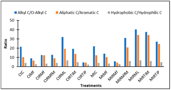 The aliphatic/aromatic ratio was lowest under MtRMf (4.27) and highest under MtRTiM (34.27) was the highest. The alkyl C/O-alkyl C ratio was lowest under CtRTiP (4.78) and highest under MtRML (40.34). The Hydrophobic C/Hydrophilic C ratio was the lowest under CtRTiP (2.30) and highest under MtRML (6.86) (Figure 4).