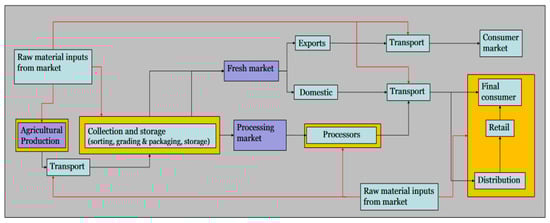 The Spanish F&V supply chain is highly adapted to the type of market it serves, involving a wide range of products and a huge variety of agents operating from the producers to the end consumers [22]. Figure 1 summarizes the schematic diagram of the F&V supply chain covering both fresh and processed products, and portraying the main stages, participants, areas of activity, and their respective interrelations.