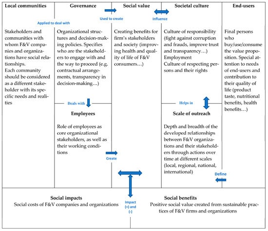 Figure 3 shows the social layer with the different variables, factors, and interrelations for each one of the nine building blocks. Major potential social benefits have been identified for instance in the areas of working conditions, stakeholder commitment, and nutritional and health benefits. Hence innovating and improving these areas will provide highly appreciated social value. Indeed, and as in the other layers, for each potential innovation, costs and benefits should be evaluated systematically.