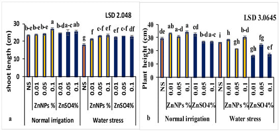 Effect of foliar application of ZnNPs and ZnSO4 on (a) shoot length and (b) plant height of the golden turnip variety under drought stress. Error bars specify the standard error, and columns with different letters exhibit variations among treatments. LSD, least significant difference at 0.05.