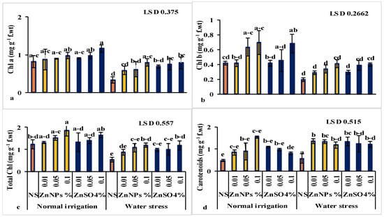 Effect of foliar application of ZnNPs and ZnSO4 on (a) Chl a, (b) Chl b, (c) total chlorophyll, and (d) carotenoid contents of turnip leaves under drought stress. Error bars specify the standard error, and columns with different letters exhibit variations among treatments. LSD, least significant difference at 0.05.