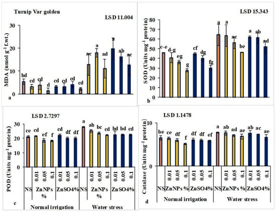 Effect of foliar application of ZnNPs and ZnSO4 on (a) MDA, (b) SOD, (c) POD, and (d) CAT activity of the golden turnip variety under water-deficit conditions. Error bars specify the standard error, and columns with different letters exhibit variations among treatments. LSD, least significant difference at 0.05.