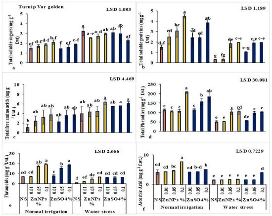 Effect of foliar application of ZnNPs and ZnSO4 on leaf biochemical attributes, including (a) total soluble sugar, (b) total soluble protein, (c) total free amino acids, (d) total phenolics, (e) flavonoids, and (f) ascorbic acid, of the golden turnip variety under drought stress. Error bars specify the standard error, and columns with different letters exhibit variations among treatments. LSD, least significant difference at 0.05.