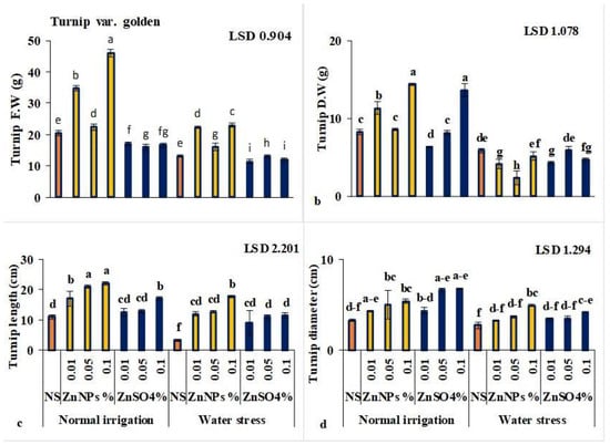 Effect of foliar application of ZnNPs and ZnSO4 on (a) fresh weight, (b) dry weight, (c) length, and (d) diameter of the golden turnip variety under drought stress. Error bars specify the standard error, and columns with different letters exhibit variations among treatments. LSD, least significant difference at 0.05.