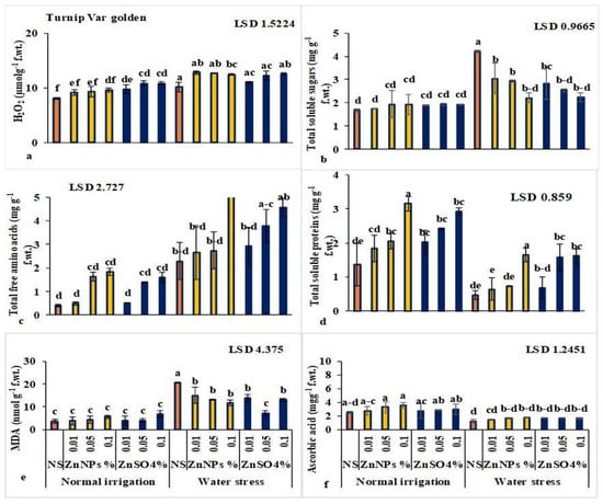 Effect of foliar application of ZnNPs and ZnSO4 on (a) H2O2, (b) total soluble sugars, (c) total soluble proteins, (d) total free amino acids, (e) MDA, and (f) ascorbic acid of the golden turnip variety under drought stress. Error bars specify the standard error, and columns with different letters exhibit variations among treatments. LSD, least significant difference at 0.05.
