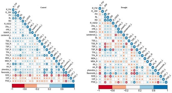 Pearson correlation between different attributes of the golden turnip variety reveals the impact of treatments under control and drought stress on turnip leaves and roots. * Highly correlated either positive or negative with colors. TSP_L = total soluble proteins in leaves; TSP_R = total soluble proteins in roots; TFA_L = total free amino acids in leaves; TFA_R = total free amino acids in roots; TSS_L = total soluble sugars in leaves; TSS_R = total soluble sugars in roots; SOD_L = superoxide dismutase activity in leaves; POD_L = peroxidase activity in leaves; CAT_L = catalase activity in leaves.