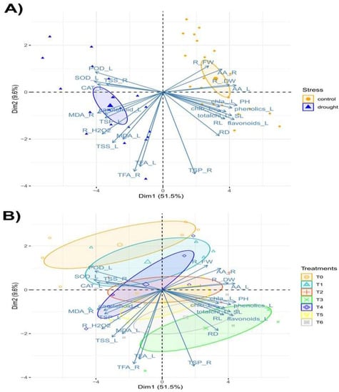 Principal component analysis (PCA) showing the relationship among different measured variables of turnip leaves and roots under control and drought stress. (A) Comparison of non-stressed and stressed plants (B) Comparison among treatments. T0 = control; T1 = 0.01% ZnNPs; T2 = 0.05% ZnNPs; T3 = 0.1% ZnNPs; T4 = 0.01% ZnSO4; T5 = 0.05% ZnSO4; T6 = 0.1% ZnSO4.