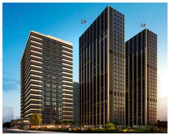 The project is located in Jiangning District, Nanjing, China. The project’s No. 2 and No. 3 buildings are identical structures. For every structure, the aboveground building area is approximately 34,000 m2, with a total height of 146.5 m. The project shows a U-shaped plane layout; the maximum and minimum equivalent widths are 69.23 m and 26.32 m, respectively. The maximum height-to-width ratio is 5.56. The 1st~10th floor, 12th~19th, and 21st~31st floors are 4.8 m in height, with the LOFT apartment function, while the remaining 11th and 20th floors, used for refuge, are 3.6 m in height. No structural joint is set between the single tower and the underground parking. The project’s location (II-type regarding site classification) corresponds to the seventh level of seismic intensity, and according to the seismic design, it can be classified into the first group. Based on geological exploration data, the characteristic period of ground motion is 0.39 s [3,4]. Figure 1 depicts the architectural rendering.