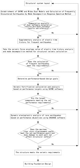 In the elastic stage of structural design, this project adopts dual software comparative verification and conducts elastic time history supplementary analysis for frequent earthquakes for envelope design. For fortified earthquakes and rare earthquakes, the design method of setting performance targets for key parts can effectively control the damage situation of structural key components and prevent collapse under rare earthquakes [6,7]. The design process is shown in Figure 2.