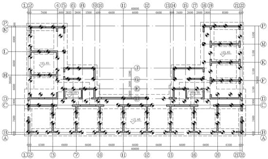 The project has a Level-II standard fortification category in structural safety, with a design working life of 50 years [5]. The building is at Level-7 of seismic fortification intensity and in the first group regarding design earthquake grouping. The basic seismic acceleration is 0.10 g. The standard snow load and fundamental wind pressure in the 50-year return period are 0.65 and 0.40 kN/m2, respectively. The ground roughness is classified as B-type, and the shape factor is 1.4.