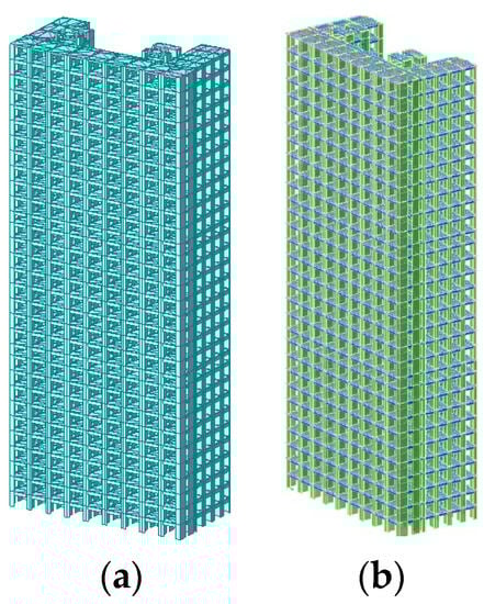 In this study, Finite Element Analysis and Design Software for Multistory and High-rise Buildings (SATWE, Version 3.1.6), compiled by the China Academy of Building Research, was used for calculation. In addition, MIDAS GEN (version 8.6), compiled by Beijing MIDAS Information Technology Co., Ltd. (Beijing MIDAS Information Technology Co., Ltd. is a wholly-owned subsidiary of Midas IT in Seoul, South Korea), was used for supplementary calculation. Figure 5a,b display the calculation models.