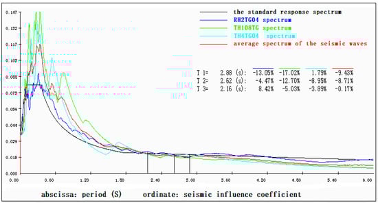 This study performed the elastic time-history analysis with SATWE to validate the results with the mode-decomposition response spectrum method and ensure a safe and reliable structure. During the present time-history analysis, two sets of natural waves (TH4 and TH108) and a set of artificial waves (RH2) were used. The durations of these three sets of seismic waves were 40, 34, and 30 s, respectively, which exceeded the greater value between five times the structural natural vibration period (T1) and 15 s. The seismic wave was recorded at an interval of 0.02 s. The peak accelerations of frequent, fortified, and rare earthquake action were 35, 100, and 220 cm/s2, respectively. Figure 6 compares the seismic acceleration response spectrum and the standard response spectrum at the periodic points of the first three orders. The results satisfy the requirement of Article 4.3.5 in JGJ3-2010 [4].