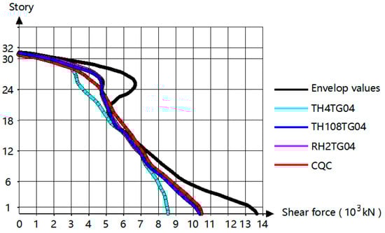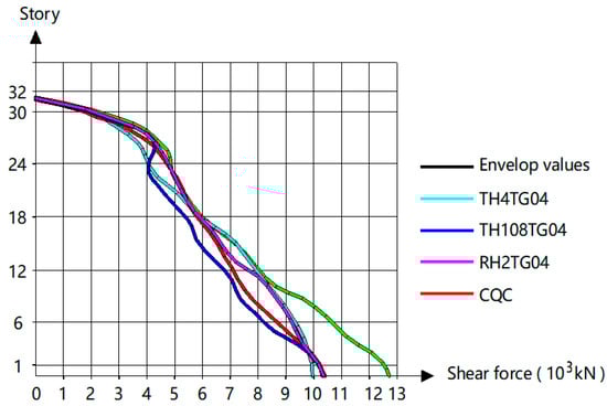 Figure 7 and Figure 8 depict the story (floor) shear forces obtained via the elastic time-history analysis. The difference between the envelope value of the time-history shear forces of the three seismic waves and the value calculated with the vibration mode decomposition response spectrum method is below 15%. The envelope values using time-history analysis and the vibration decomposition response spectrum method should be taken to analyze the seismic force effect. The shear force amplification coefficient should be automatically considered for each floor (story) in the calculation program.