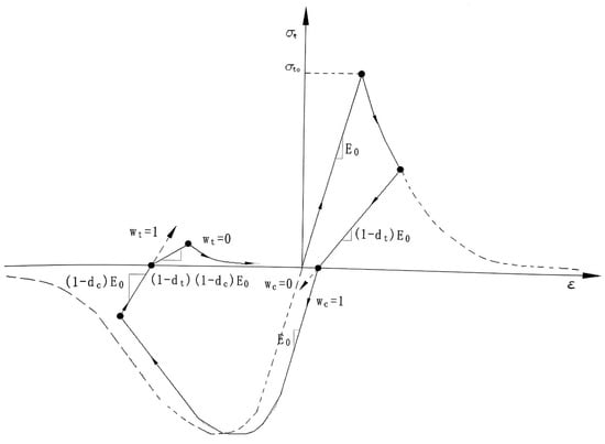 Concrete stiffness dropped when entering the plastic state, as shown in the stress-strain curve and damage chart. The stiffness damage can be described by tensile damage parameter dt and compressive damage parameter dc. The values of dt and dc were determined by the degree of concrete entering the plastic state. The two-dimensional (2D) constitutive model of concretes adopted the elastoplastic damage model, which thoroughly considered the difference in tensile/compressive strengths, stiffness/strength degradation, and stiffness recovery induced by the closure of fractures in tension/compressive cycles [21,22]. As the load changed from tension to compression, the fractures in the concretes were closed, and the compressive stiffness recovered to the original value. When the load changed from compression to tension, the tensile stiffness of the concretes was not restored, as shown in Figure 10.