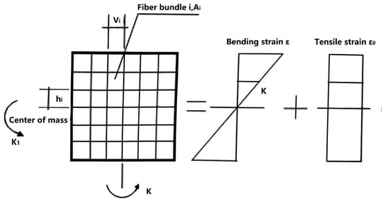 The fiber bundle can be made of steel or concrete. Given k1, k2, and ε0, the strain of fiber bundle i can be written as ε1 = k1 × hi + ε0 + k2 × vi, and the sectional bending moment M and axial force N can be written as: