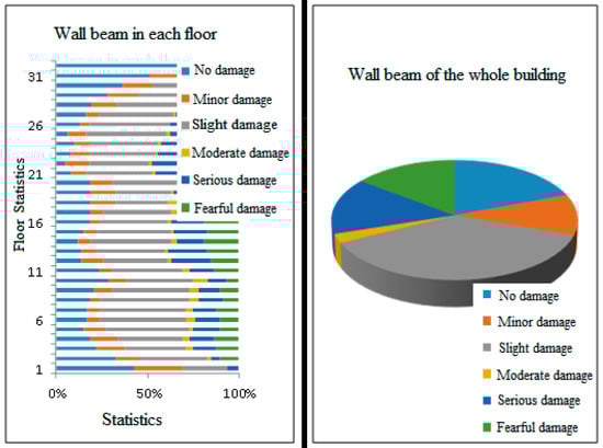 According to the dynamic elastoplastic analysis results, the vertical components in the bottom reinforcement parts and the transition layer were partly finely damaged, and some were only slightly damaged; the vertical components in the other floors were slightly damaged to varying degrees, and some were moderately damaged; and most of the coupling beams entered into the yield state, and some were severely damaged, suggesting that coupling beams significantly contributed to energy dissipation. The structure satisfied the anti-seismic action. Figure 12 shows the state of the shear wall under the RH2-x great earthquake, and Figure 13 illustrates the statistics on beam performance indices.