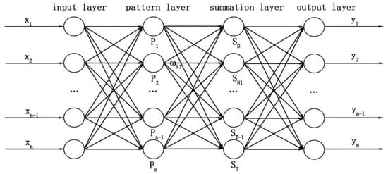 - Input layer. The number of input neurons is equal to the dimension of the input vector in the learning sample, and each neuron is a simple distribution unit that directly transmits the input variables to the pattern layer;