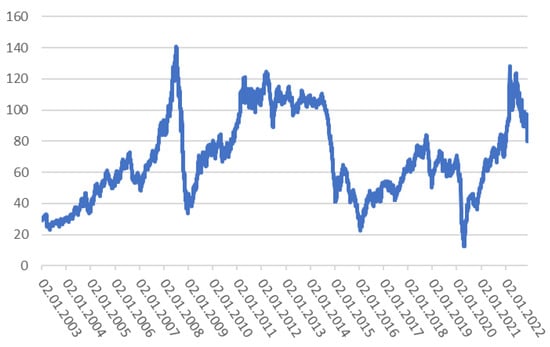 The last two years were marked by a reversal of the general trend of gradual decline in consumer price inflation in Europe over the last four decades (1980–2020), which had overlapped with the undesirable effects of the SARS-CoV19 epidemic on the economy and society [1,2]. The rise of the Core Consumer Price Index, one of the essential indicators used to assess inflation, was accelerated by the increase in the demand for fossil fuels in the same period, which in turn led to a peak increase of more than five times of the Oil Price on the International Market, even though this tendency was necessarily consistent throughout the years, as some sharp drops and recoveries were reported, as evidenced in Figure 1 [3].